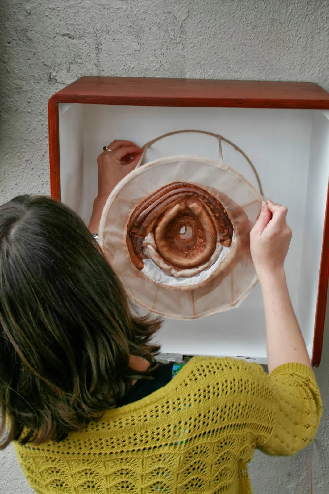 “Melissa Wilson creates abstract sculptures that are both visceral and aesthetically pleasing. Her subdued colours and fluid forms create a feeling of familiarity as well as a mild disconcertion, as if you are looking at a very pretty representation of your own organs. The sculptures themselves are quite complex, fabric is sculpted, sewn and manipulated around fine skeletal structures. It was a pleasure to host Melissa’s show at RAS!”